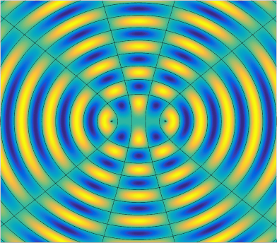 After adjustment, the (anti)nodal lines get fuzzier when they spread out, which is similar to what happened in the reality comparing to the photo in the beginning. I hide the contour plot because they no longer form a clear pattern as before. Because of the way it is adjusted, the amplitude at the point source will approach infinity (the denominator approaches zero). This is where the simulation falls short (notice the point source is extremely bright), and I am not sure how to fix it, so feel free to let me know if you have better ideas.