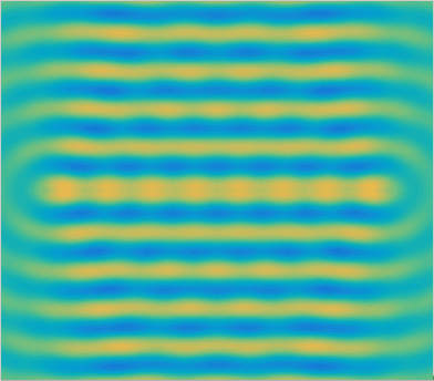 Great! With this wave function, we can finally create the simulation by computing the amplitude at all points on a plane over some period of time. When there are more than one wave source, the amplitude of a given point on the plane is the sum of the amplitude of the wave from every source. After tuning some parameters for presentation, the final result looks like this.